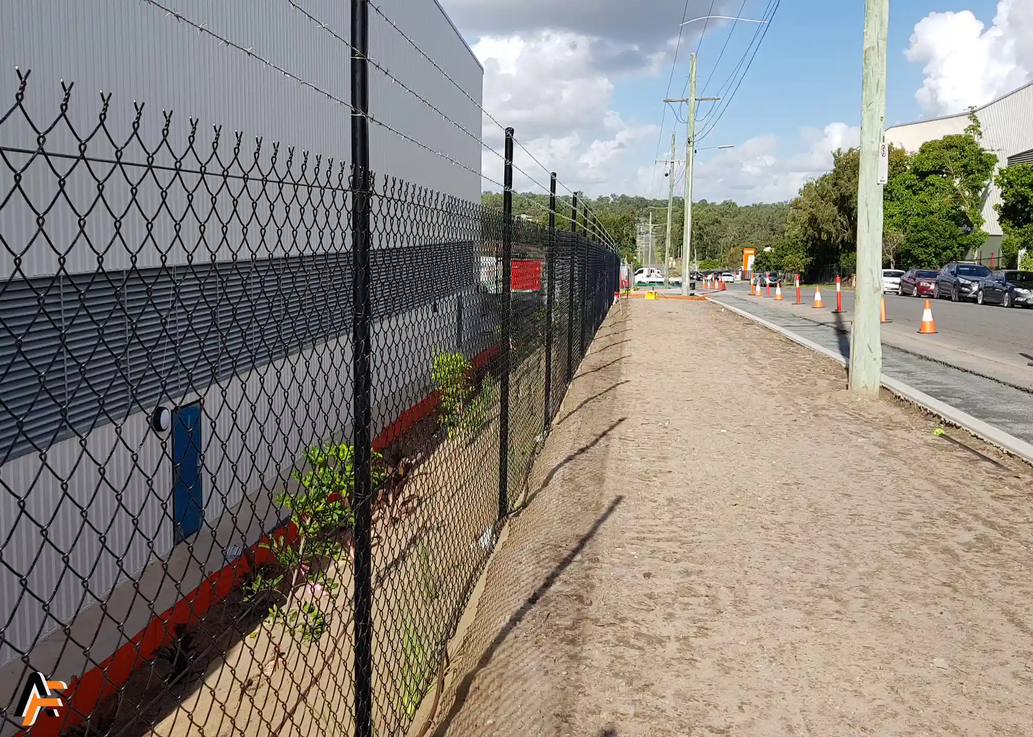 Commercial-grade chain wire fencing with barbed wire extension, reinforcing site security along the Gold Coast industrial precinct.